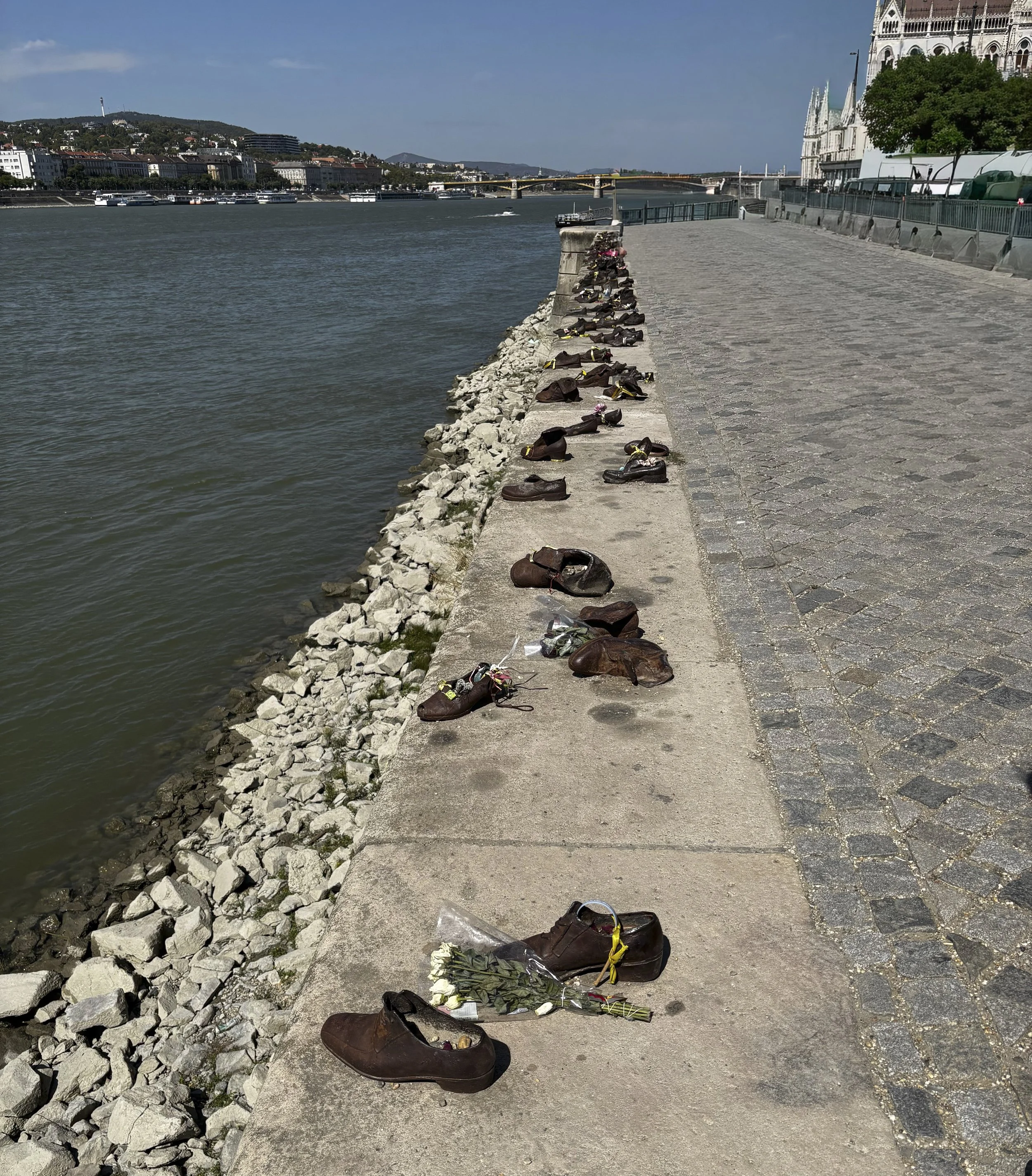 From Wiki: The composition titled 'Shoes on the Danube Bank' gives remembrance to the 3,500 people, 800 of them Jews, who were shot into the Danube during the time of the Arrow Cross terror. The sculptor created sixty pairs of period-appropriate shoes out of iron. The shoes are attached to the stone embankment, and behind them lies a 40-meter-long, 70 cm high stone bench. At three points are cast iron signs, with the following text in Hungarian, English, and Hebrew: "To the memory of the victims shot into the Danube by Arrow Cross militiamen in 1944–1945. Erected 16 April 2005. Follow here for more.