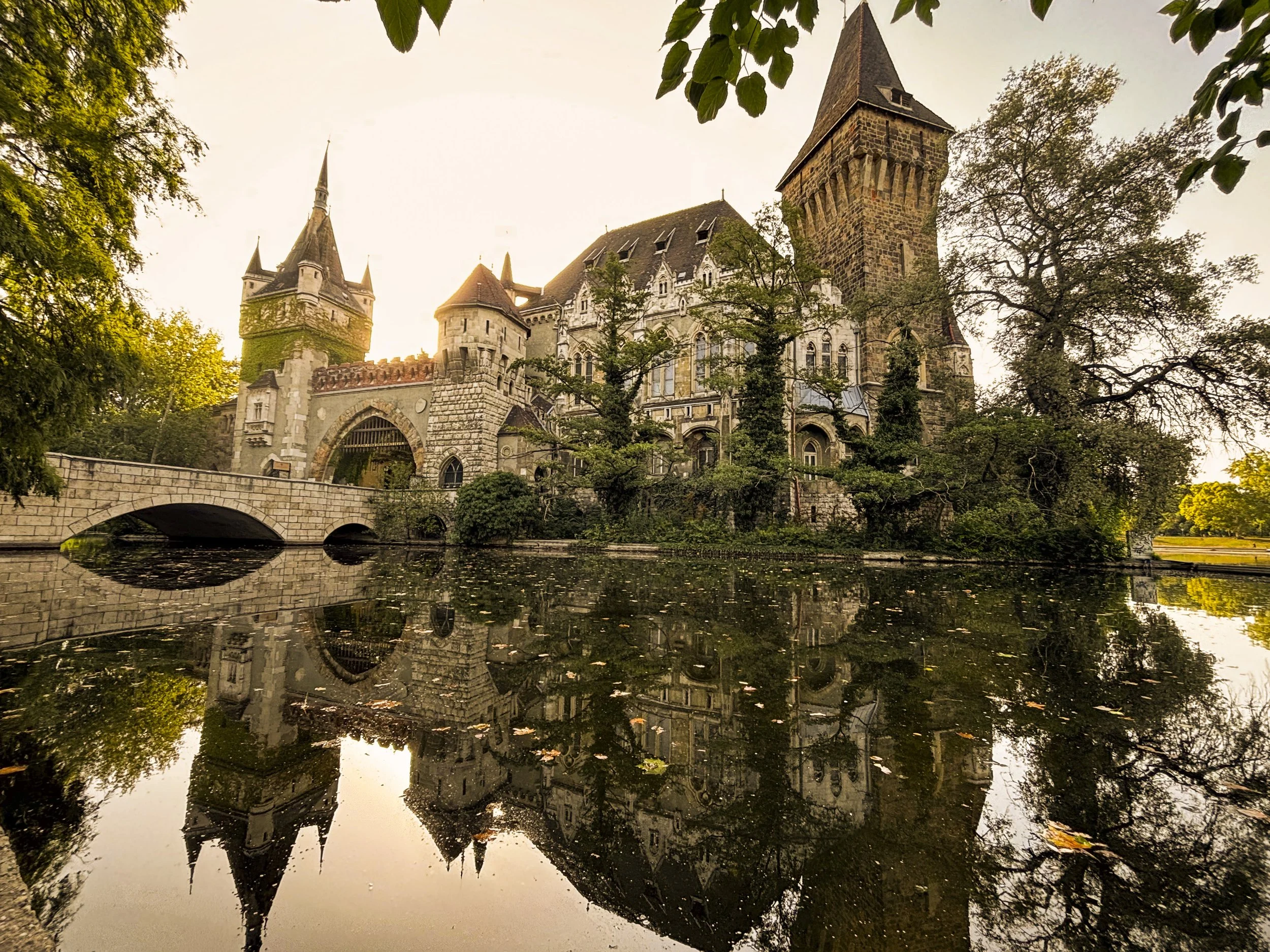 The lakeside view of Vajdahunad Castle in City Park, not quite early enough as the sun is almost over the roof.