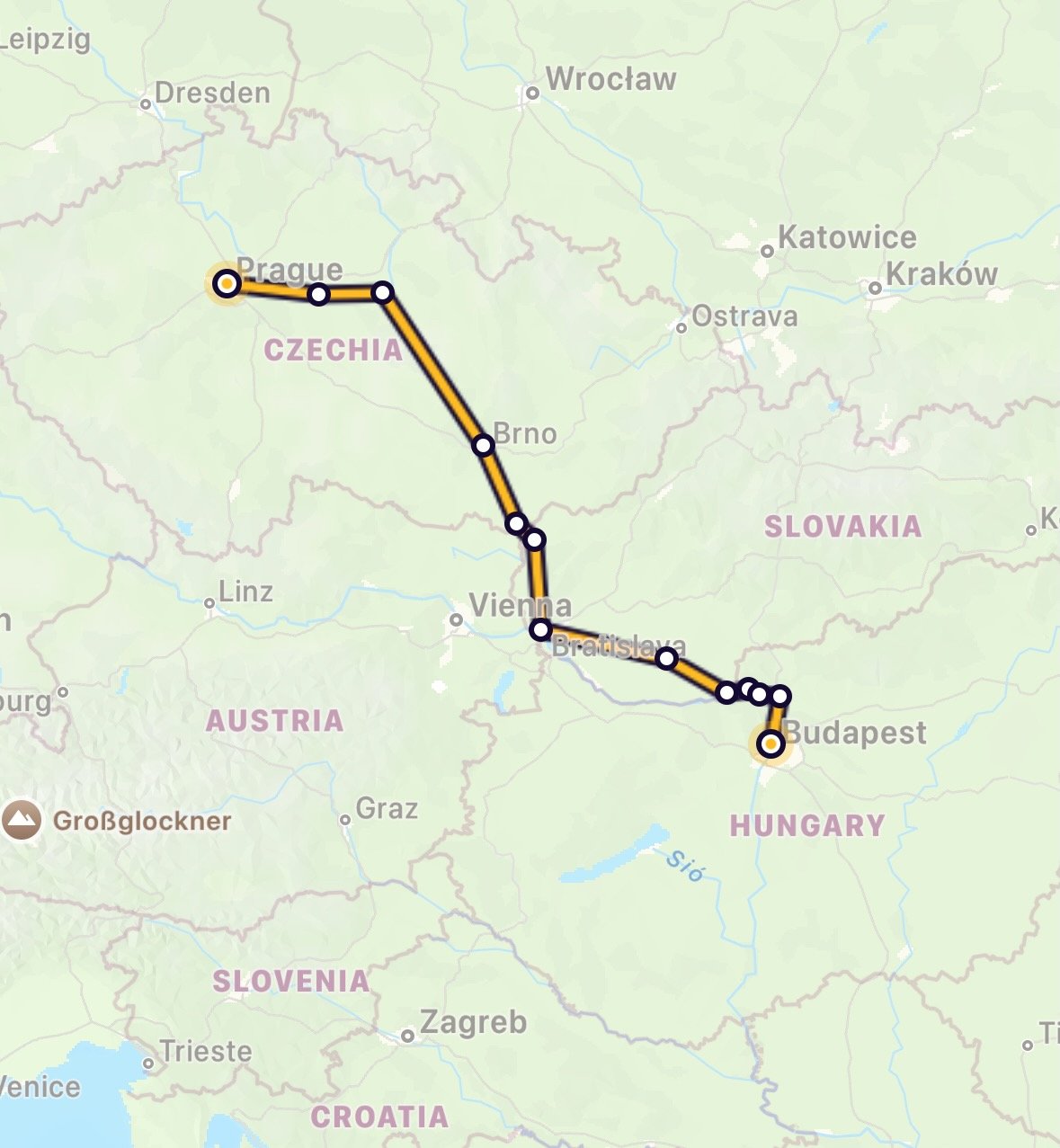Prague Hlavni Nadrizi to Budapest Nyugati on EC275 7hrs direct.