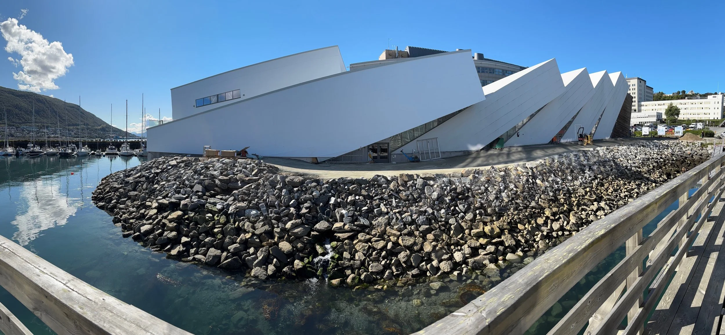 The unique building in Tromsø that is often described as resembling fallen books is the Polaria aquarium. Its architecture is designed to mimic the look of ice floes or toppled books.