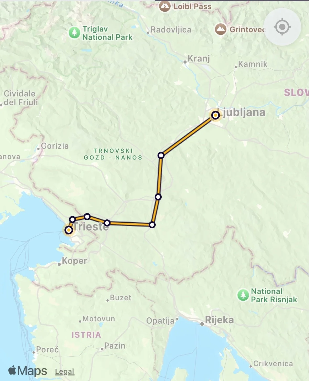 When our tickets were checked we were told that we would have to get off at one particfular stop and then get a bus to the next station and then get back on a train for the final leg of the journey. We were reassured that the buses would be waiting etc and that most people on the train would be doing the same thing. As we drew close a lady that we had been chatting to and was travelling solo mentioned that she had been told by another train conductor that when we got off the train we would have to wait for another train that wouldn’t get us into Trieste around 8pm. This would be 3 hours later than we should have been there. Luckily something was obviously lost in traslation somewhere along the line as the first conductor was correct. Slight gasp when we saw the line up at the border and police closing different lanes. For a moment I though “oh this will be fun, everyone getting their luggage out at the side of the road to locate their passports!” But of course that was not the case and we arrived only 15 minutes late.